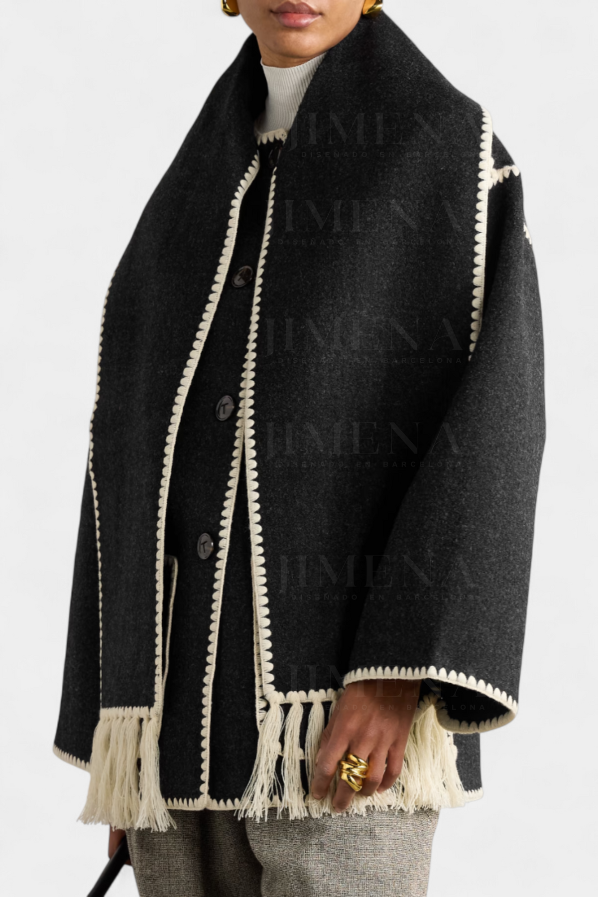 • Bufanda de flecos incorporada que aporta textura y funcionalidad