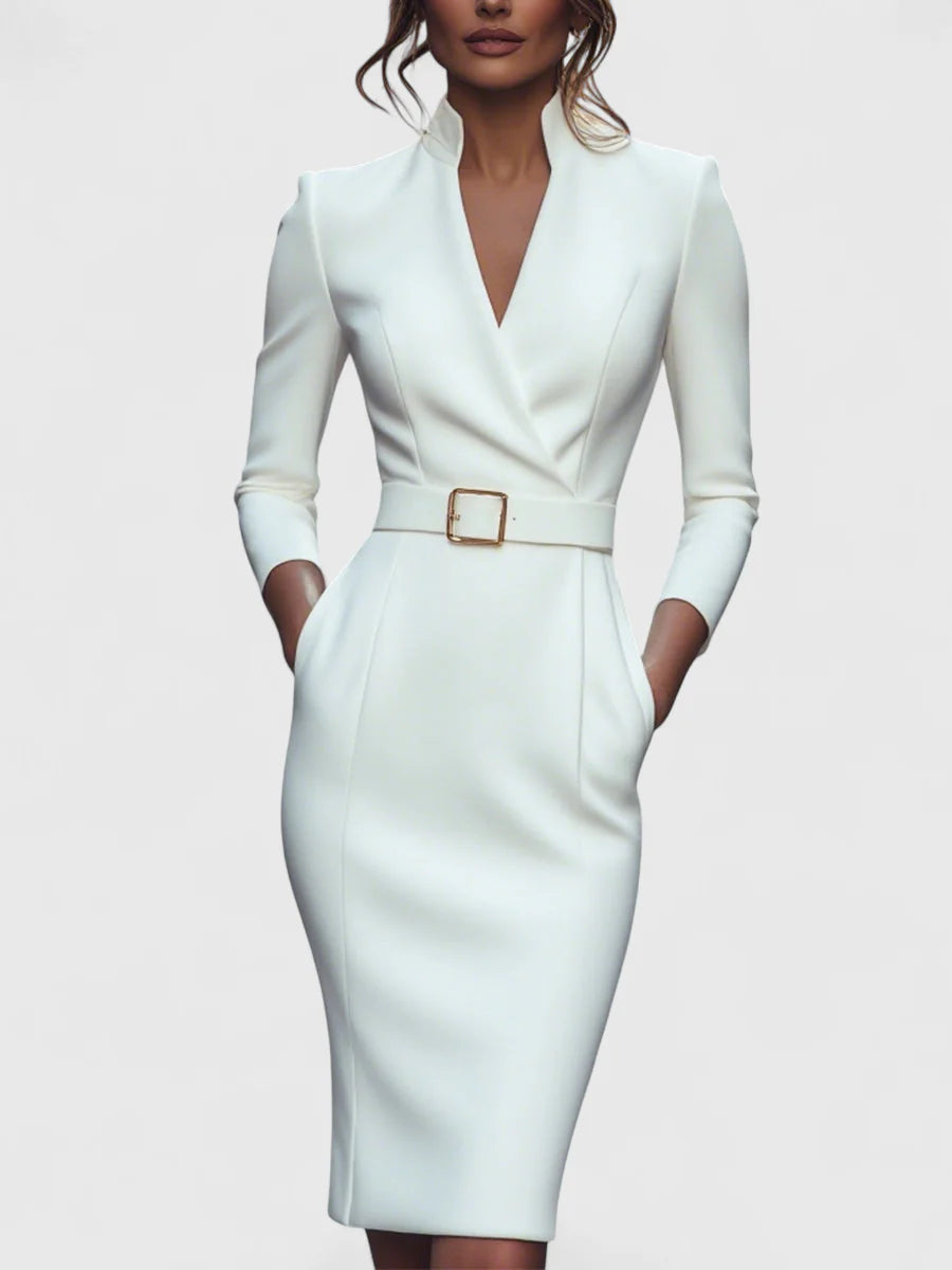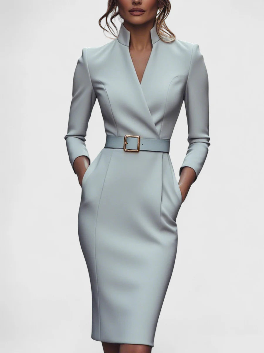 Minimalismo sofisticado con un aire de poder y distinción. El vestido Adriana combina líneas limpias con una silueta entallada que realza la figura gracias a su escote cruzado, mangas tres cuartos y cinturón con hebilla metálica que define la cintura con precisión. Una pieza que transmite fuerza, feminidad y modernidad en cada paso.