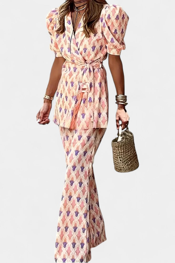 Araceli Conjunto Estampado con Blazer y Pantalón Acampanado