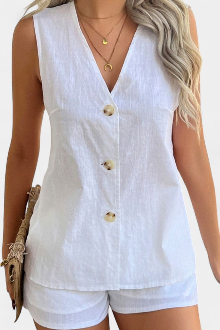 • Camisa sin mangas con escote en V y botones para un look estructurado y limpio