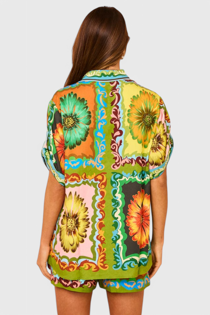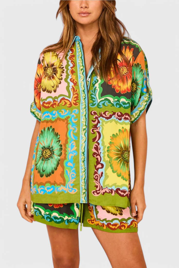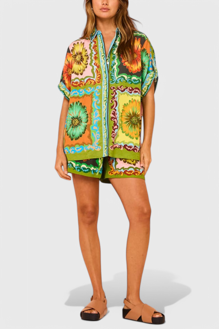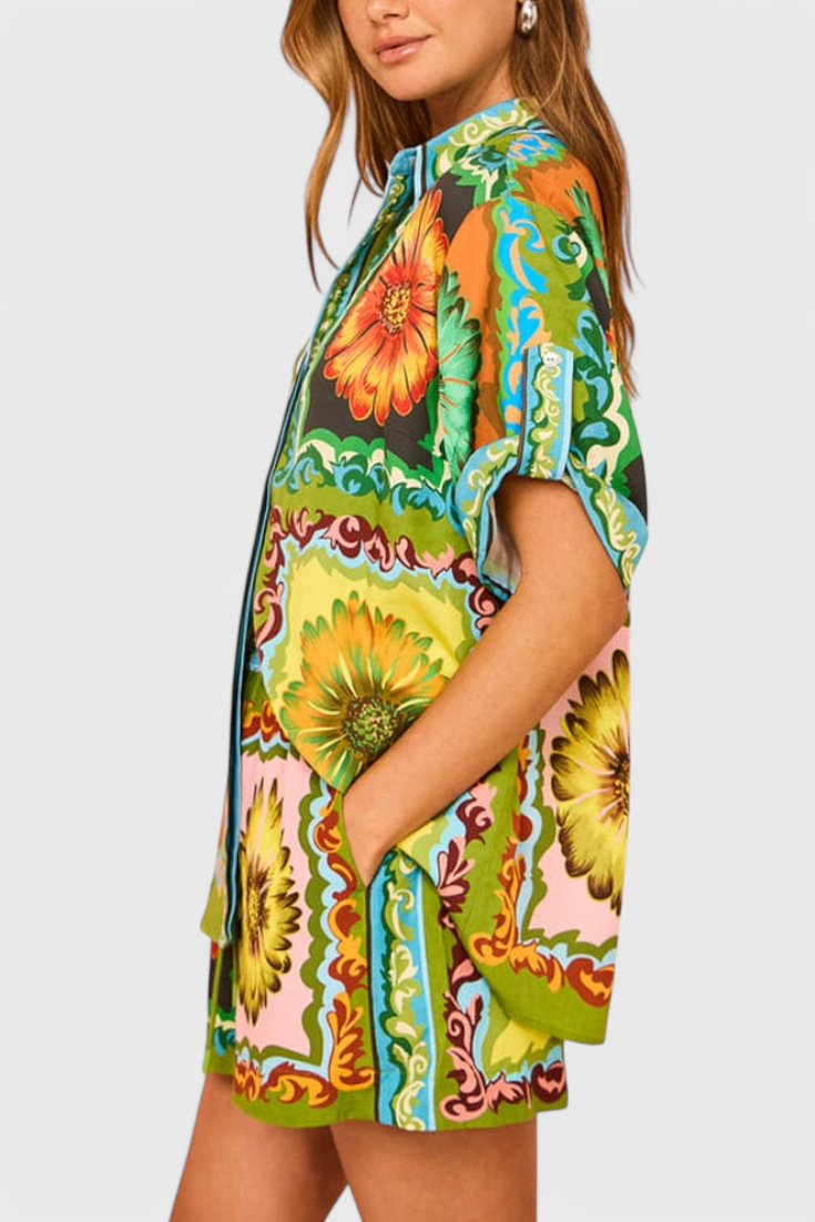 Ilumina tu guardarropa de verano con este conjunto de pantalones cortos de satén con estampado de girasoles. Diseñado con una suave cintura elástica y un toque ligero, ofrece un ajuste relajado con un toque de encanto. Ya sea que estés descansando o saliendo, aporta comodidad y estilo sin esfuerzo a cada momento.
