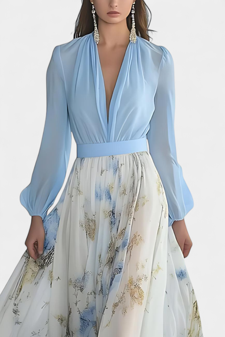 Elegancia etérea con un toque artístico y moderno. El vestido Eliane combina una parte superior fluida con escote en V profundo y mangas vaporosas, con una falda larga decorada en un delicado estampado floral tipo acuarela. Su movimiento envolvente y silueta refinada lo convierten en una pieza protagonista para brillar con naturalidad.