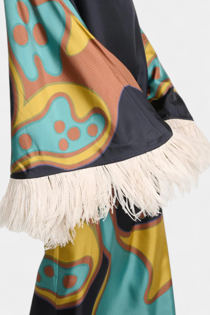 Bohemio, audaz y lleno de carácter, el vestido Kiara irradia un encanto retro que no pasa desapercibido. Con un estampado vibrante en tonos turquesa, amarillo y marrón, y un ajuste relajado con escote barco, aporta frescura y estilo sin esfuerzo. Los flecos de plumas en puños y dobladillo añaden dramatismo juguetón, creando una pieza ideal para destacar en cualquier ocasión.