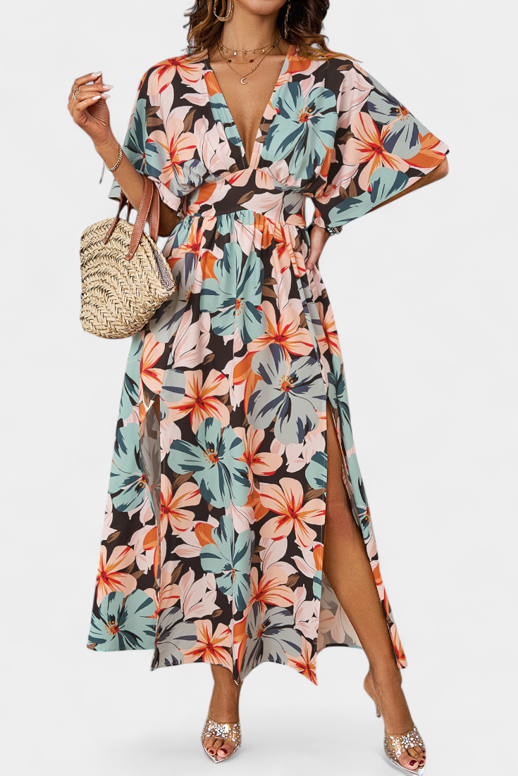 Ximena Vestido Cruzado Largo con Estampado Floral y Abertura Lateral