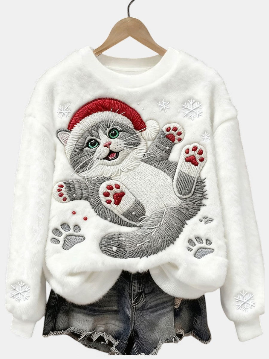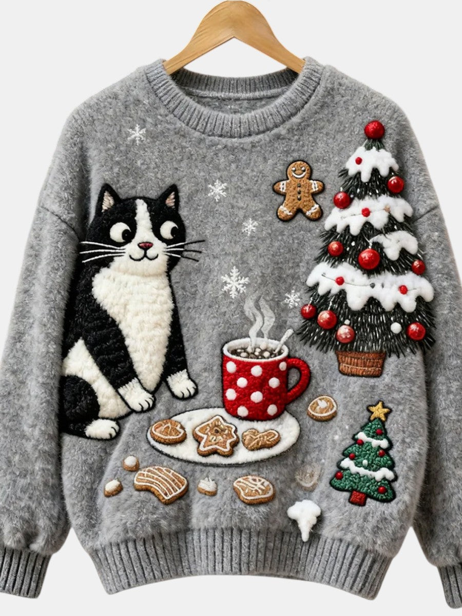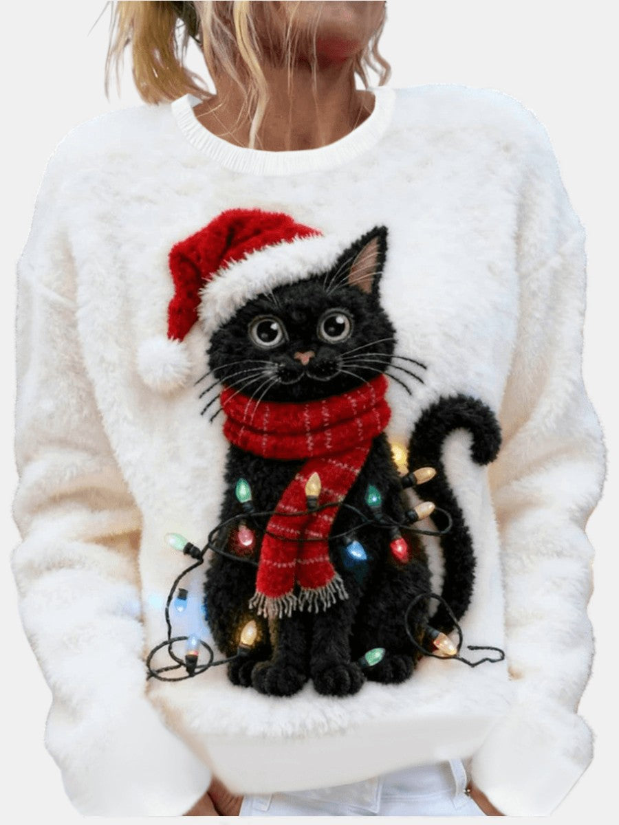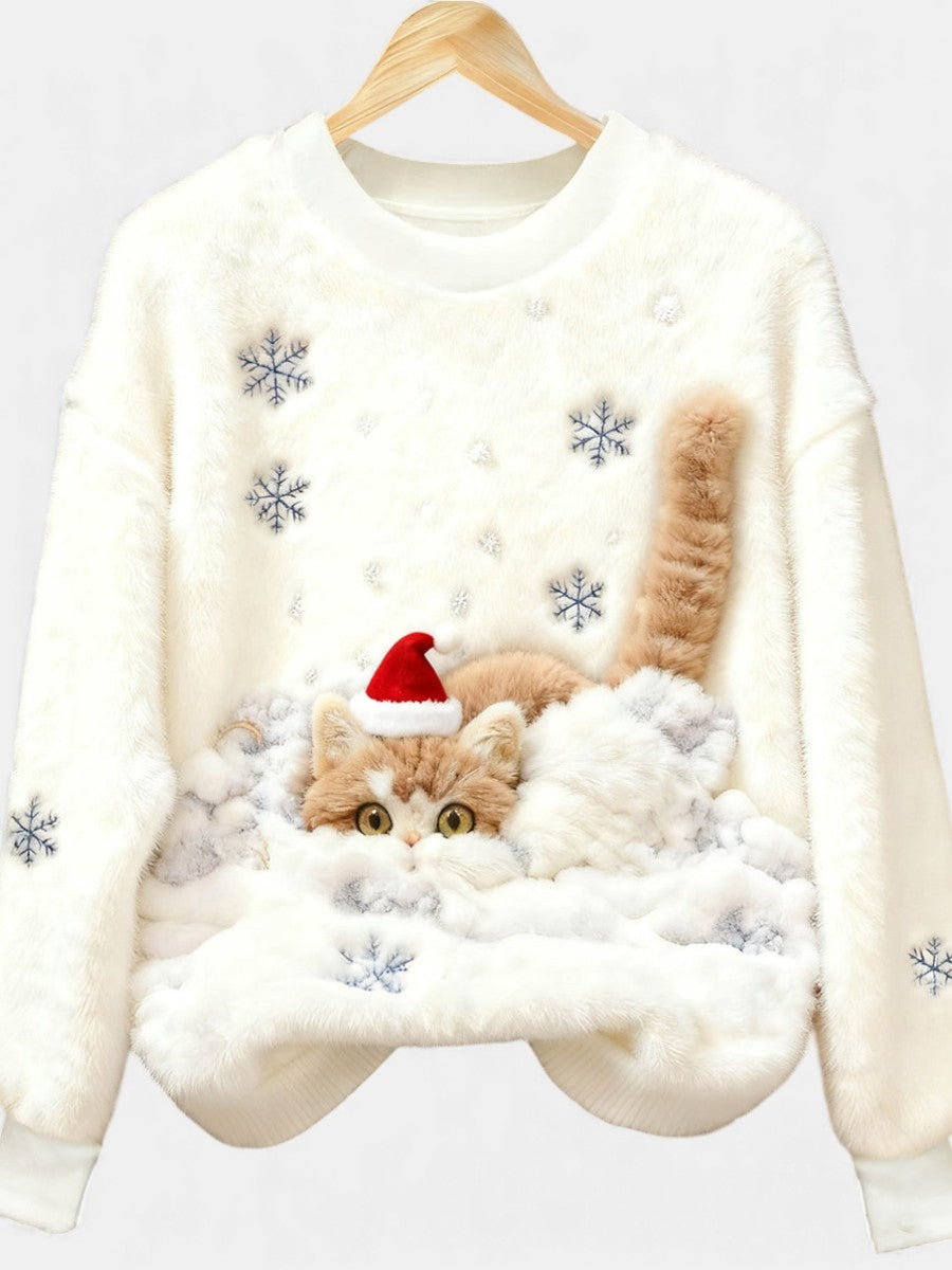 Suéter Casual de Franela Iris con Arte de Gato Navideño
