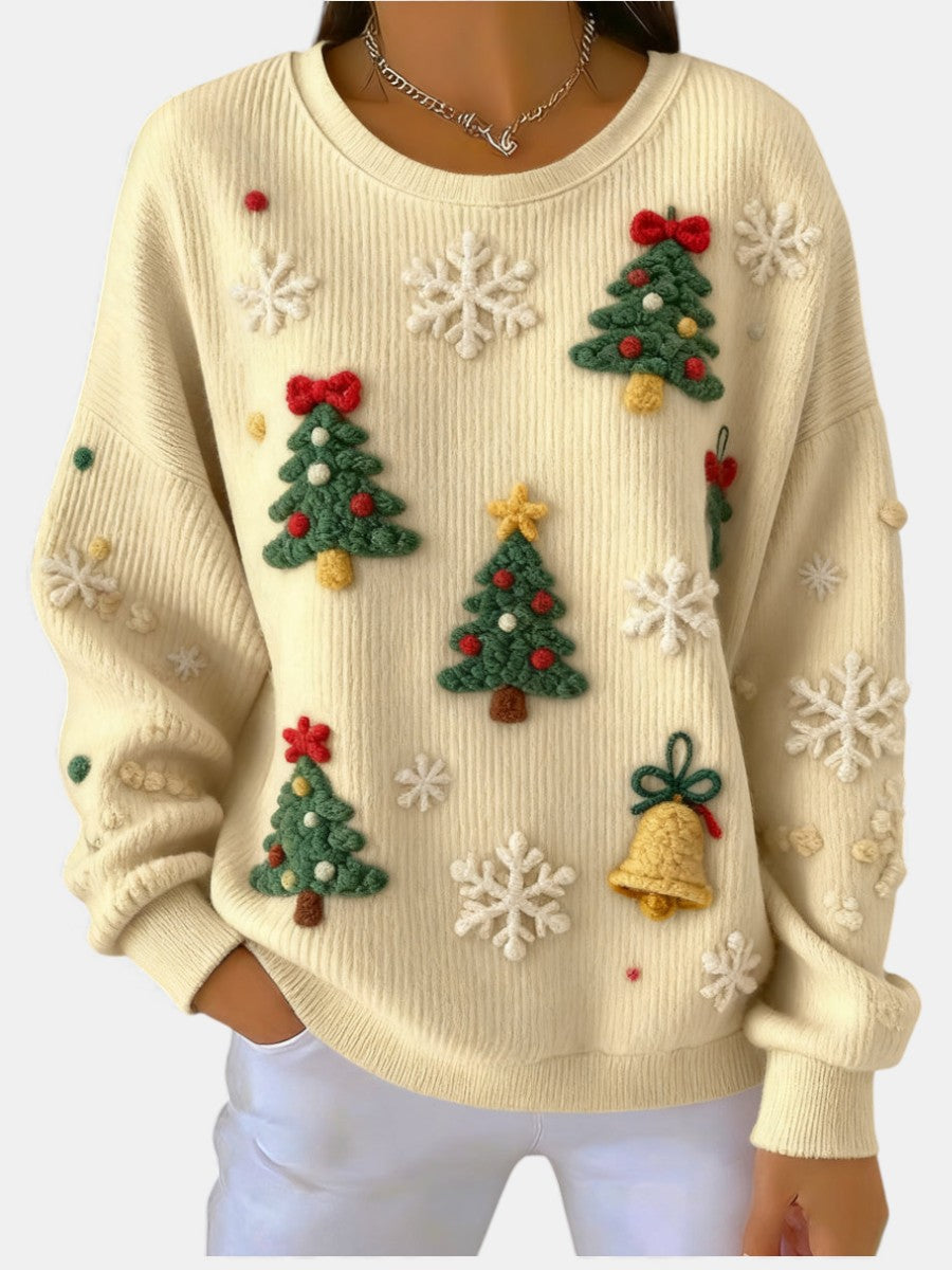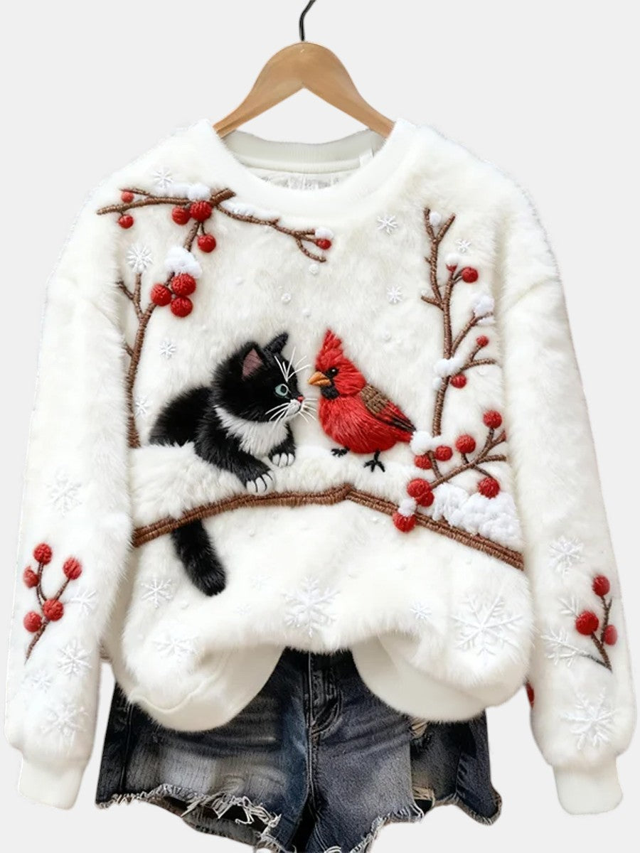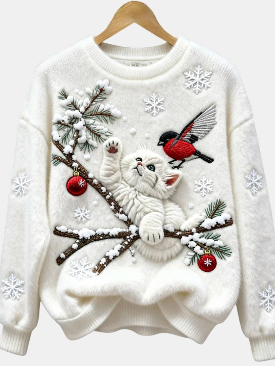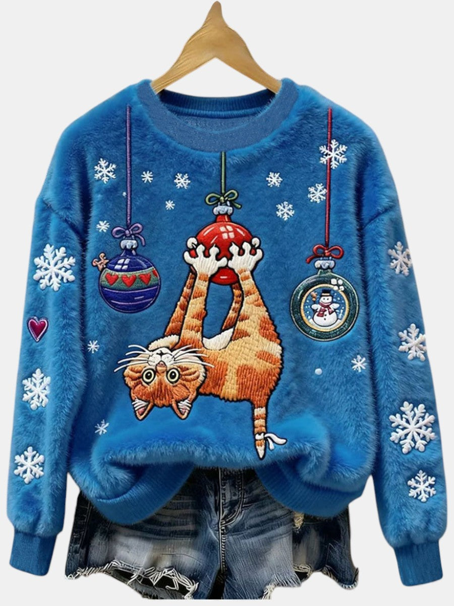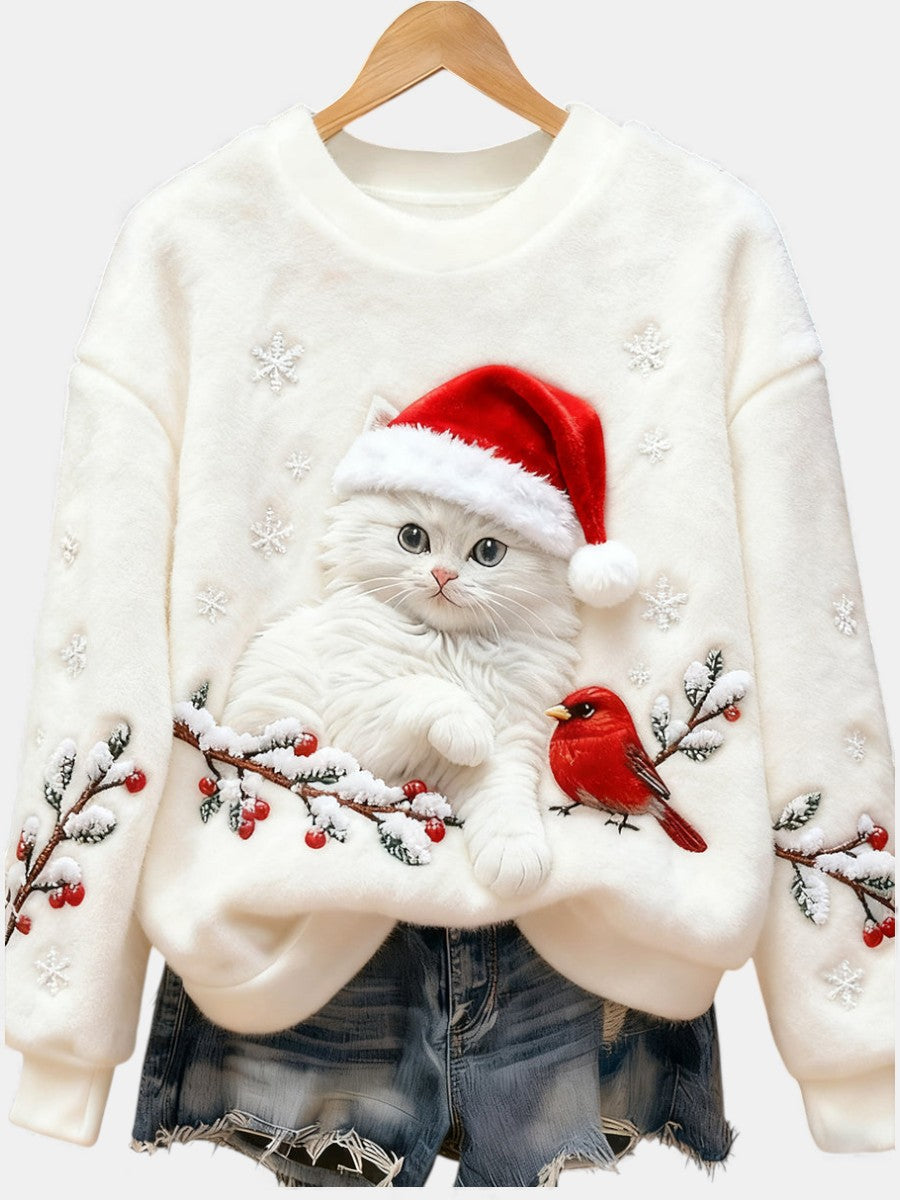 Suéter Casual de Franela Iris con Arte de Gato Navideño