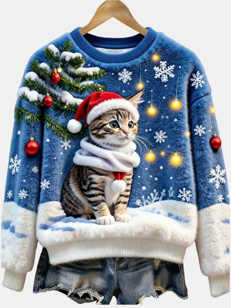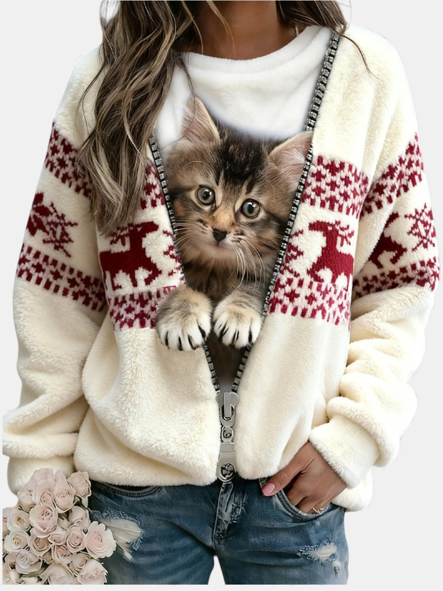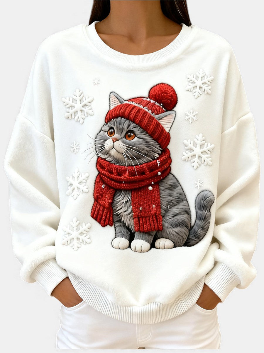 Sudadera Casual de Franela Aroa con Arte de Gato Navideño