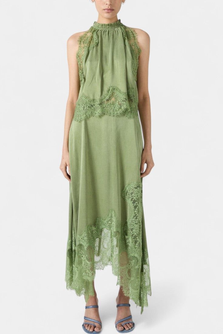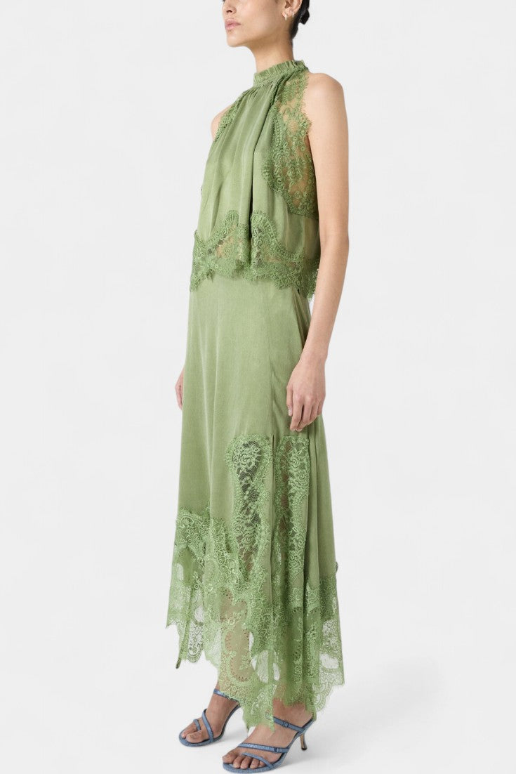 Un conjunto que irradia movimiento, frescura y sofisticación atemporal. Coralena combina una falda midi con delicados paneles de encaje y un dobladillo asimétrico que aporta fluidez en cada paso, junto a un top coordinado que equilibra elegancia y modernidad.