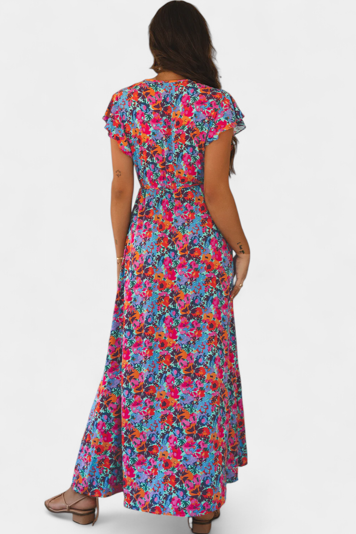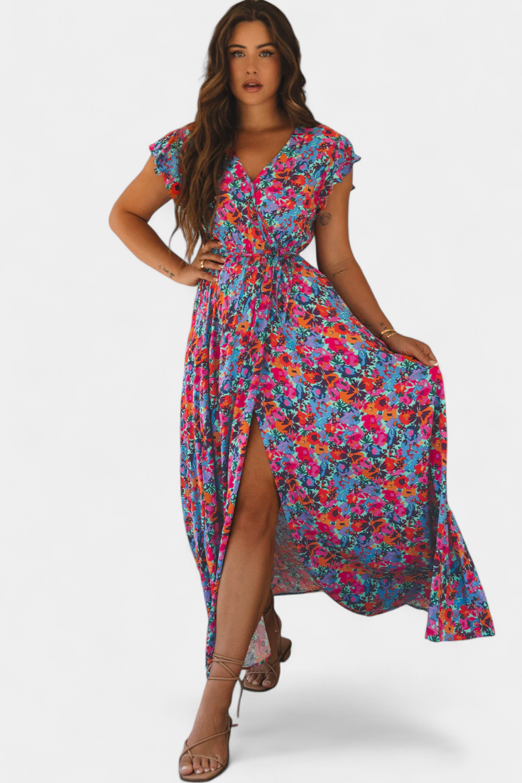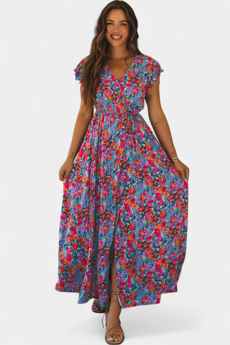 Ximena Vestido Cruzado Largo con Estampado Floral y Abertura Lateral