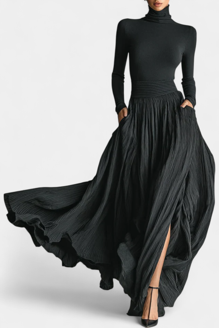 Una propuesta contemporánea que combina sobriedad y estilo dinámico. Orren destaca con una camiseta de cuello alto ajustada que perfila la silueta con distinción, acompañada de una falda plisada que añade movimiento y fluidez. Su color negro total lo convierte en un conjunto atemporal y versátil para múltiples ocasiones.