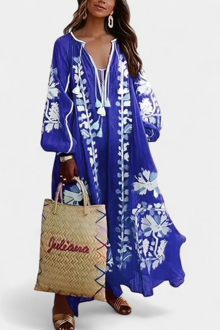 Con una silueta relajada y detalles artesanales, el vestido Alessia es sinónimo de encanto natural y libertad de movimiento. El bordado floral contrasta con el fondo vibrante, mientras que las mangas largas abullonadas y el escote con cordones crean un equilibrio perfecto entre comodidad y estilo boho.