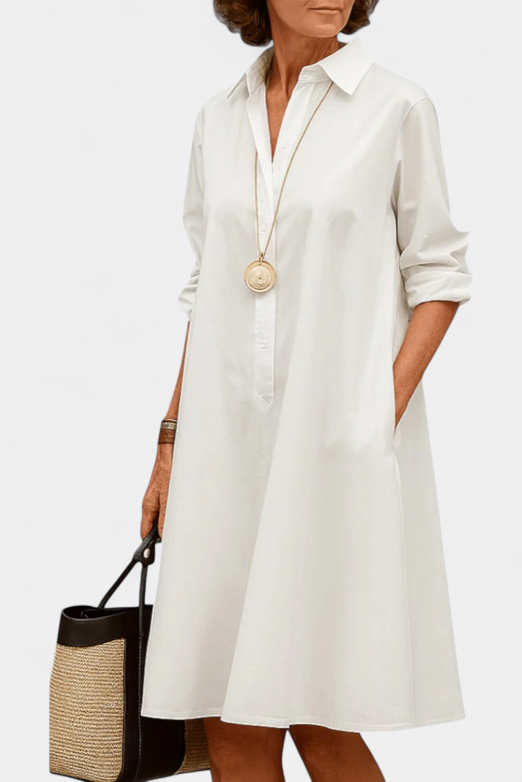 Simplicity that speaks with elegance. The Larissa dress is made from a blend of cotton and cool silk that wraps softly and fresh. Its minimalist design features a marked lapel collar, long sleeves, and a midi silhouette that naturally adapts to urban and sophisticated contexts.