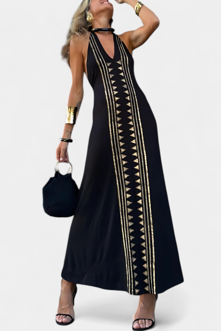Dulce Vestido Largo Halter con Espalda Descubierta y Estampado Dorado